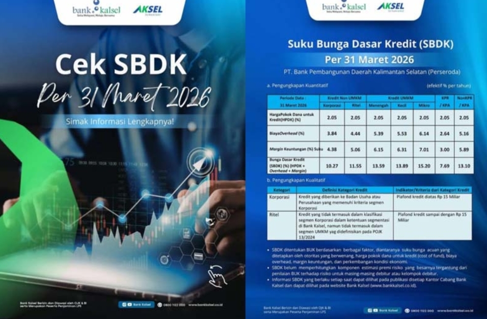 KALIMANTANDIGITAL.COM, BANJARMASIN – Bank Kalsel secara resmi merilis rincian Suku Bunga Dasar Kredit (SBDK) yang berlaku efektif per 31 Maret 2026 sebagai bagian dari upaya meningkatkan transparansi kepada nasabah dan pelaku usaha di Kalimantan Selatan.